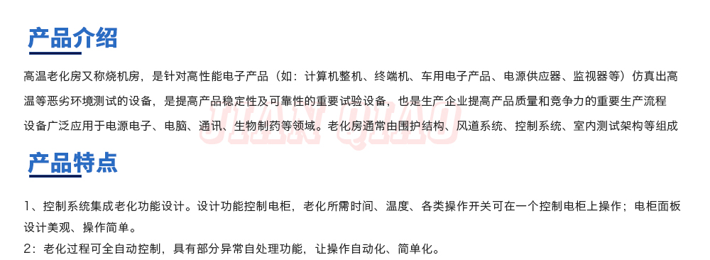 用途:高溫老化房又稱燒機房,是針對高性能電子產品(如:計算機整機、終端機、車用電子產品、電源供應器、監視器等)仿真出高溫等惡劣環境測試的設備,是提高產品穩定性及可靠性的