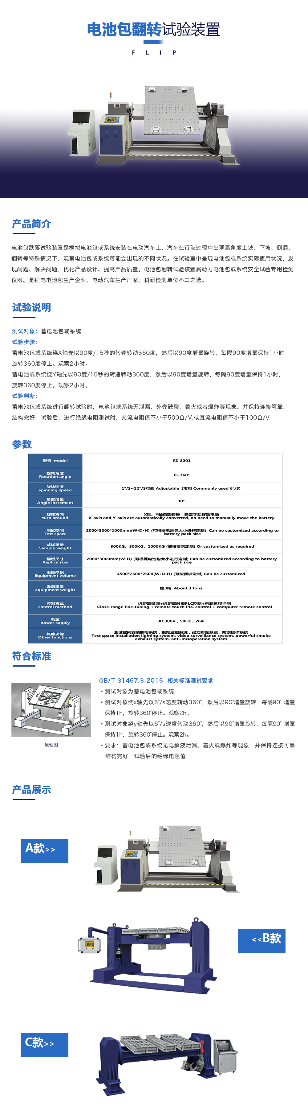 用途:電池包翻轉(zhuǎn)試驗臺是模擬電池包或系統(tǒng)安裝在電動汽車上,汽車在行駛過程中出現(xiàn)高角度上坡、下坡、側(cè)翻、翻轉(zhuǎn)等特殊情況下,觀察電池包或系統(tǒng)可能會出現(xiàn)的不同狀況。在試驗室中