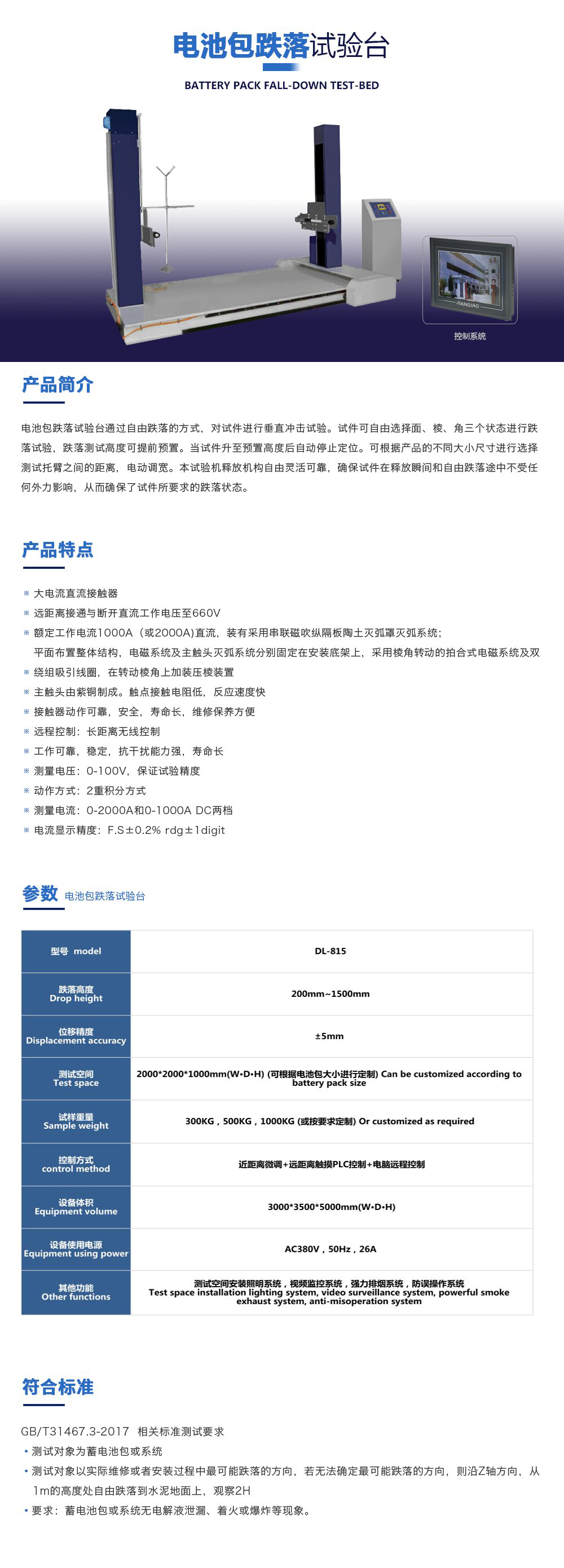 用途:電池包跌落試驗(yàn)臺(tái)通過(guò)自由跌落的方式,對(duì)試件進(jìn)行垂直沖擊試驗(yàn)。試件可自由選擇面、棱、角三個(gè)狀態(tài)進(jìn)行跌落試驗(yàn),跌落測(cè)試高度可提前預(yù)置。當(dāng)試件升至預(yù)置高度后自動(dòng)停止定位