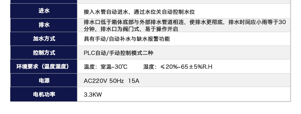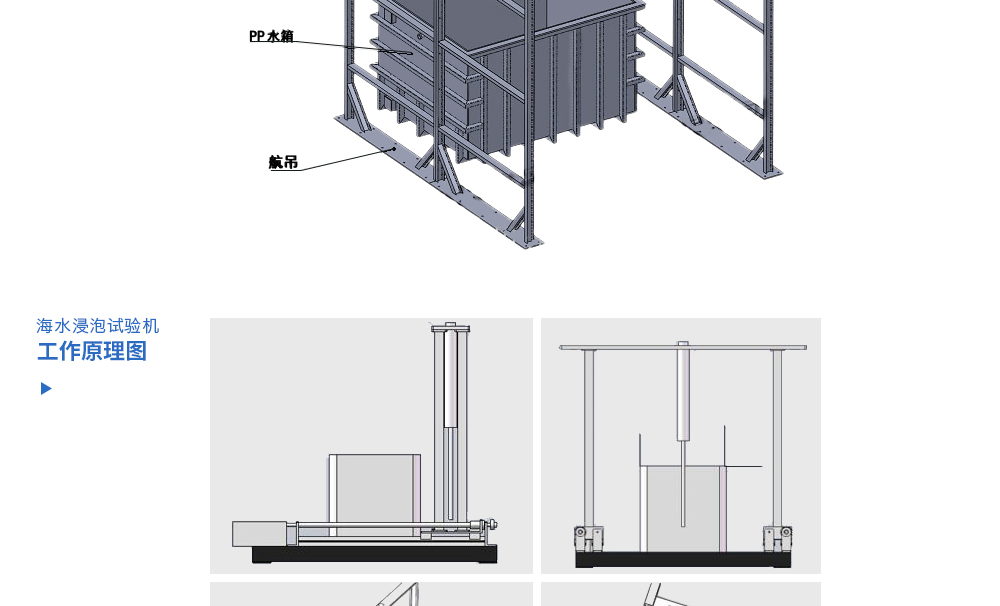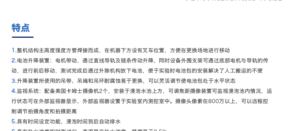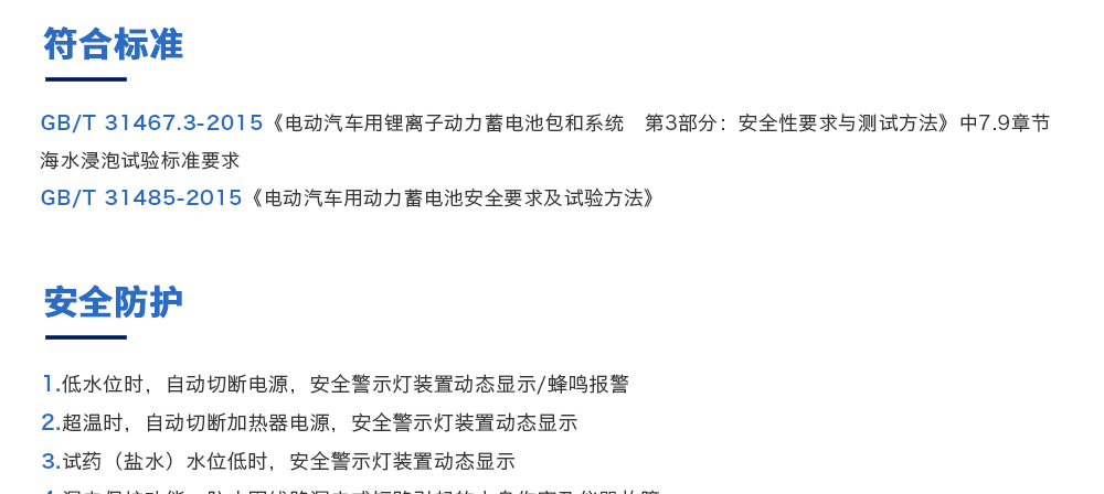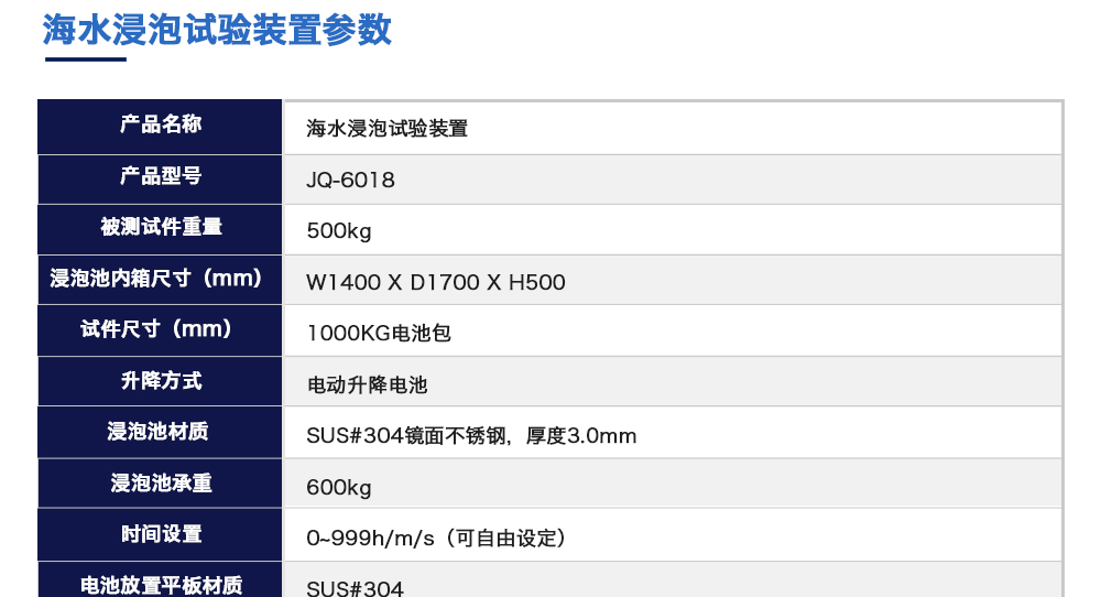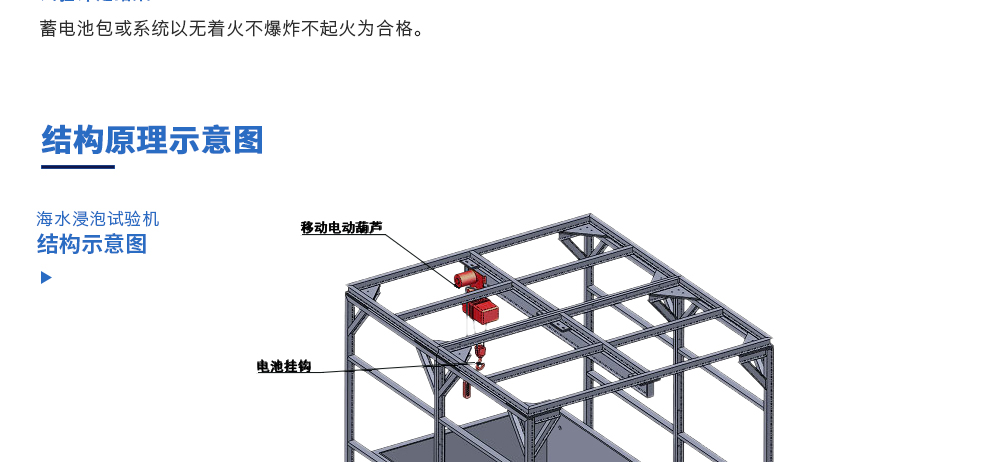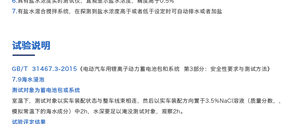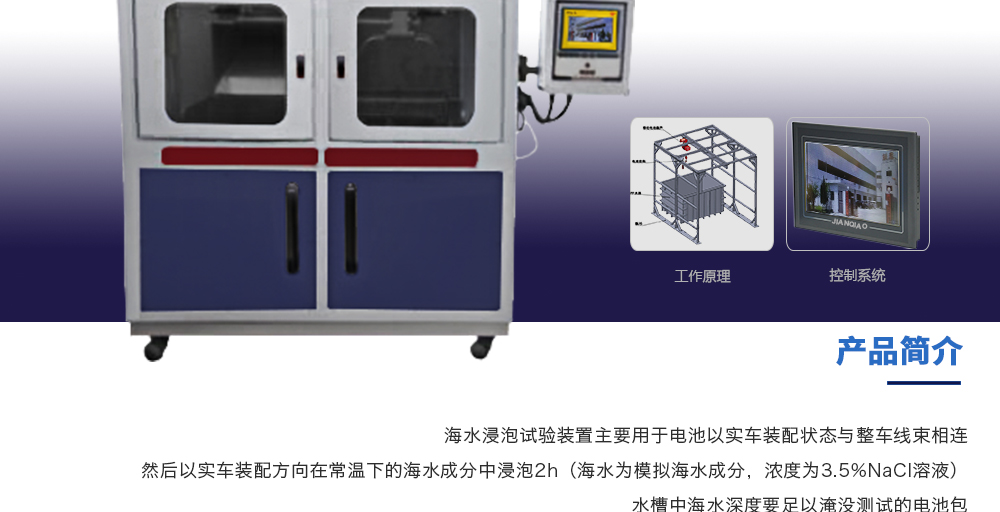 用途:海水浸泡試驗裝置主要用于電池以實車裝配狀態(tài)與整車線束相連然后以實車裝配方向在常溫下的海水成分中浸泡2h(海水為模擬海水成分,濃度為3.5%NaCl溶液)水槽中海水深度要足以淹