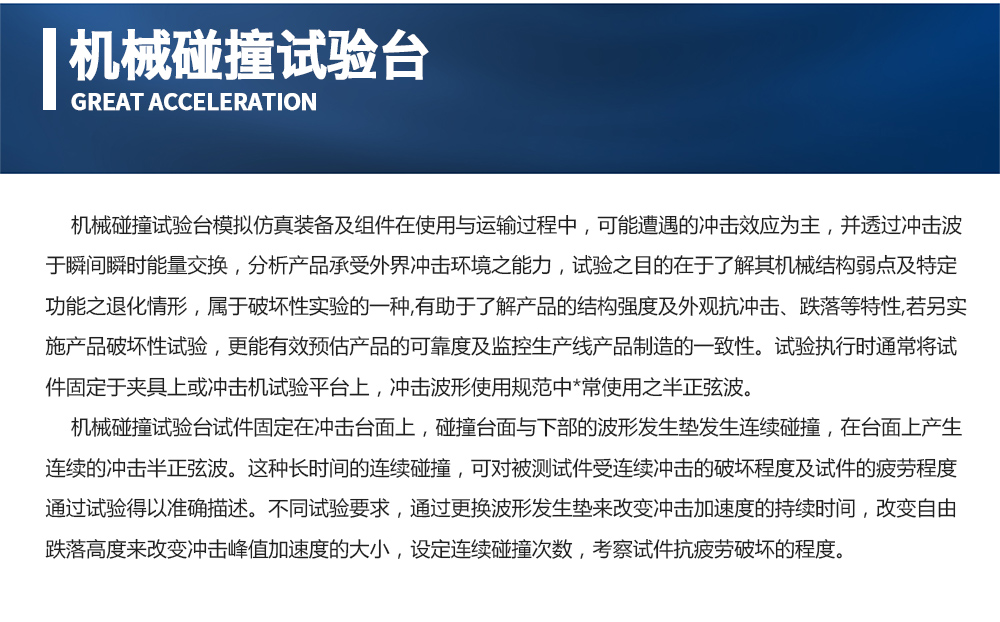 用途:機械碰撞試驗臺模擬仿真裝備及組件在使用與運輸過程中,可能遭遇的沖擊效應為主,并透過沖擊波于瞬間瞬時能量交換,分析產(chǎn)品承受外界沖擊環(huán)境之能力,試驗之目的在于了解其機